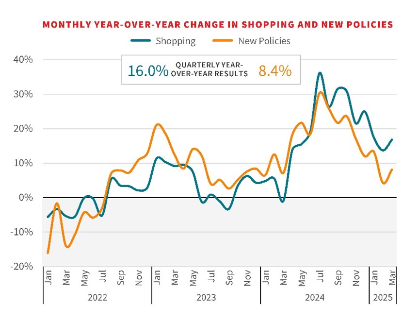 Shoppers using the direct channel helped drive first-quarter growth across all age groups, with direct distribution outpacing both independent and exclusive agent channels with a 34% year-over-year increase. Meanwhile, the non-standard market segment saw 30% growth, attributed in part by an influx of uninsured shoppers entering the market with tax refunds in hand.While tax season spurred activity, February’s shorter calendar tempered overall momentum. Compared to the Leap Year advantage in Q1 2024, 2025 featured one fewer business day, trimming shopping activity. Still, many regions saw elevated shopping growth, with 10 states reporting increases of 20% or more, including Hawaii (59%), New Jersey (43%), Washington (33%) and Massachusetts (31%).