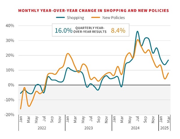 ATLANTA — After a three-quarter streak of “Nuclear” activity, U.S. consumer auto insurance shopping remained elevated in the first quarter of 2025, according to the latest LexisNexis® Risk Solutions U.S. Insurance Demand Meter. U.S. auto policy shopping growth reached “Sizzling” at 16%, and new policy growth came in “Hot” at 8.4%. Both readings represent a slight cooling from Q4 2024.