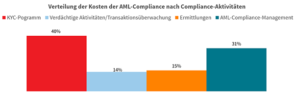 Insgesamt verteilen sich die Kosten der Geldwäsche-Compliance laut der Studie „Die tatsächlichen Kosten der AML-Compliance“ zu 75 Prozent auf Personal- und zu 25 Prozent auf Technologie-Kosten. Nach Tätigkeiten aufgeteilt fallen 40 Prozent der Kosten auf Prüfungen im Bereich „Know-Your-Customer“ (KYC), wie die folgende Grafik zeigt: