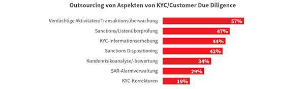 Das ist insofern auffällig, als sich gerade diese Prozesse gut für Automatisierung und Outsourcing eignen – doch nur 44 Prozent der Befragten geben an, dass diese Tätigkeiten in ihren Häusern bereits ausgelagert sind. Auch für andere Vorgänge der Geldwäsche-Compliance wie zum Beispiel die Überwachung von Sanktionslisten besteht noch ein großes Potenzial, Effizienzen zu realisieren, wie die folgende Grafik zeigt: