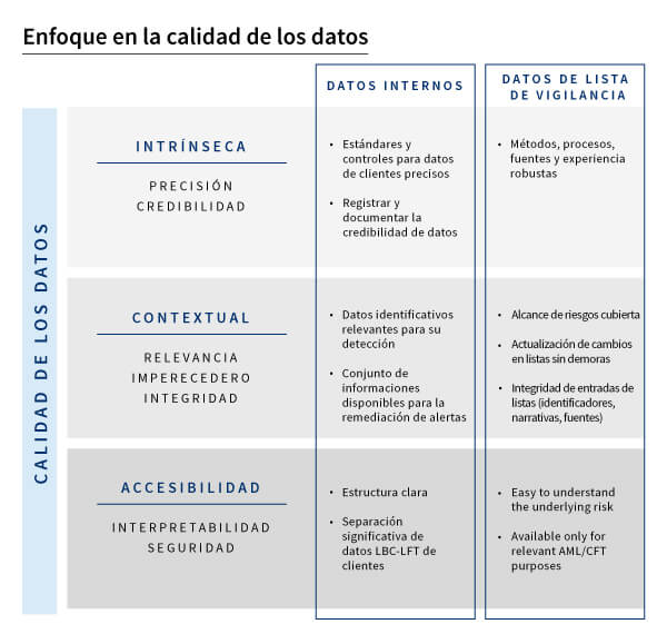 La información oportuna y precisa es la base de un sistema de filtraje y monitoreo sólido basado en el riesgo. En la mayoría de las organizaciones, esto implica una combinación de datos internos y datos de diversas listas de vigilancia obtenidas externamente. Ambos deben ser precisos, creíbles, relevantes y seguros:
