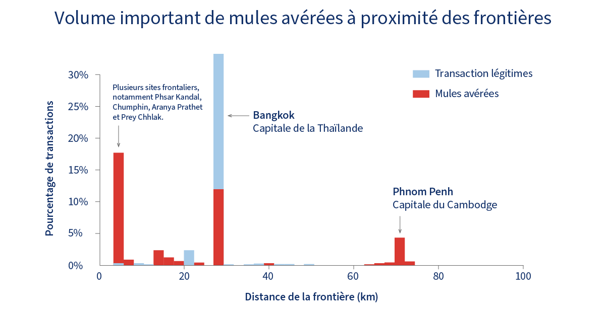 Le graphique ci-dessous montre le volume de mules confirmées dans des lieux où le volume de transactions est élevé, comme les capitales du Cambodge et de la Thaïlande, comparé au volume de mules confirmées près de plusieurs postes-frontières.