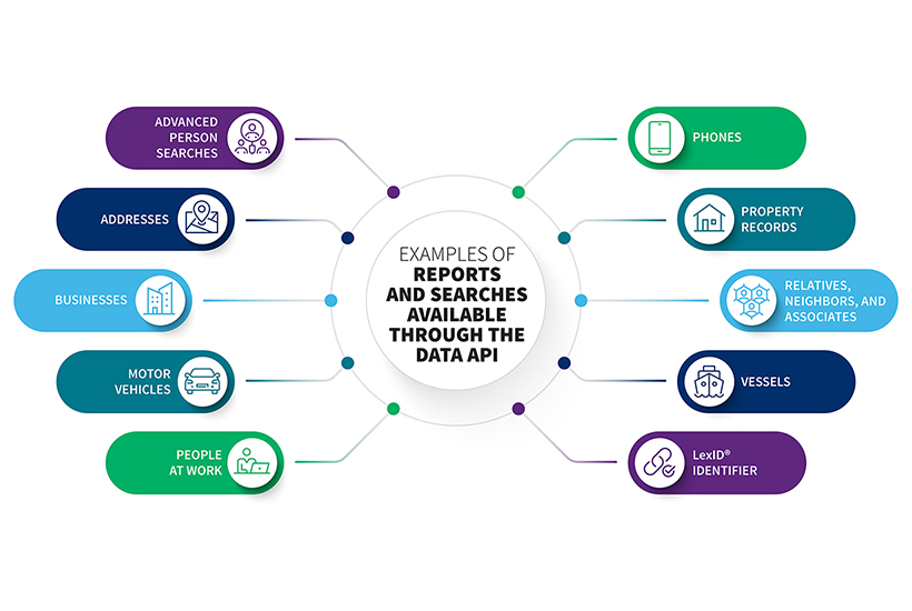 Our Accurint® Public Safety Marketplace Connected Integrators seamlessly connect data across platforms to save you critical time and amplify the depth of your investigation. With the LexisNexis® Risk Solutions Data Application Programming Interface (Data API), agencies can now directly access a vast repository of private and commercial data in most investigative products.