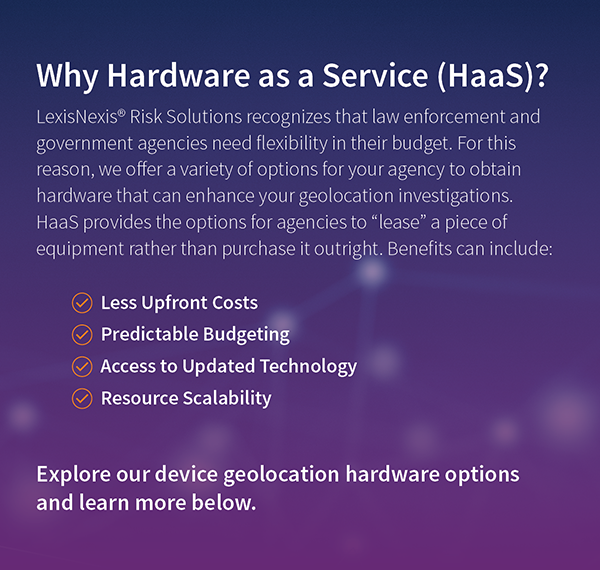 Device Setup: The LexisNexis® Risk Solutions Public Safety Special Investigations Unit will coordinate with your agency to set-up and deliver the device for successful deployment.