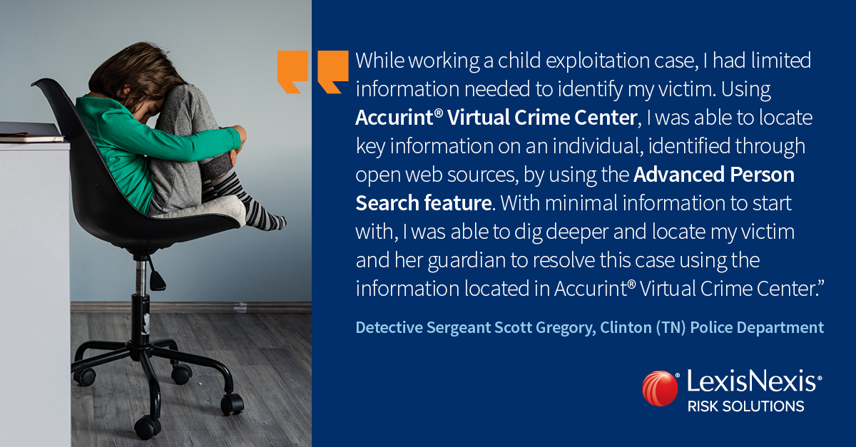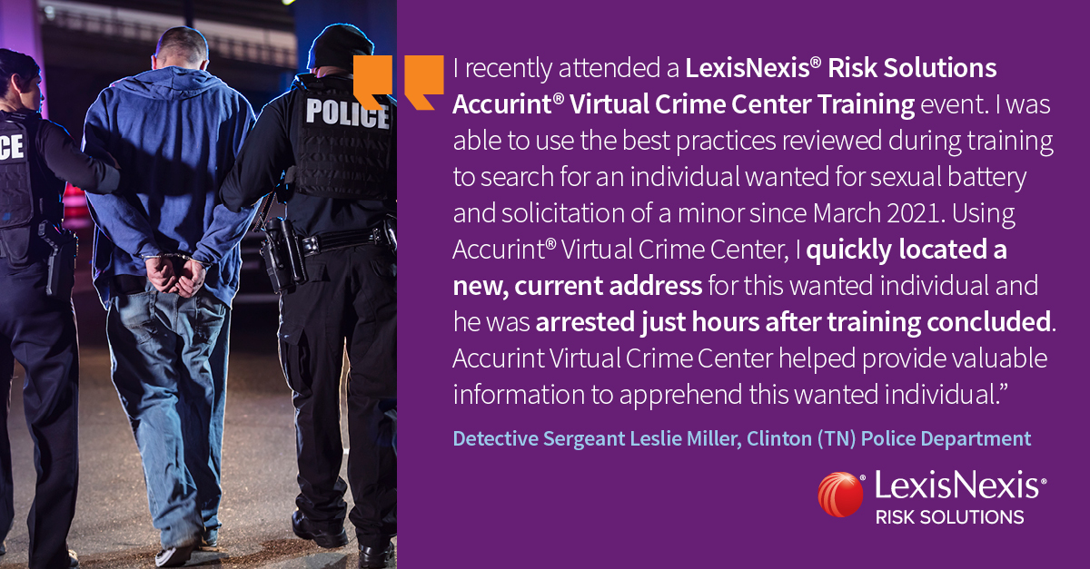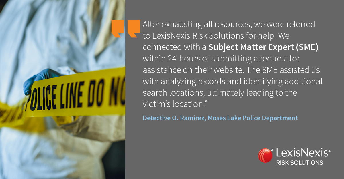 Our solutions are designed to aid agencies in successfully resolving cases. When customers successfully close a case with assistance from one of our solutions, we have fulfilled our mission. Discover why thousands of law enforcement agencies across the country trust LexisNexis® Risk Solutions to provide them with mission critical tools when every second counts.